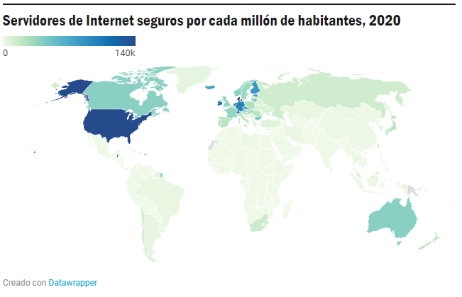 De cara al futuro, también existe el riesgo de que los trabajadores del Sur Global se enfrenten pronto a barreras mucho mayores para utilizar estas tecnologías. ChatGPT ya ha anunciado el lanzamiento de una versión premium que ofrece acceso preferente al servidor por 20 dólares al mes (para empezar a recuperar los elevados costes de su funcionamiento). Los usuarios no premium no tendrán acceso a ChatGPT cuando la capacidad de sus servidores esté al máximo. El precio constituirá una barrera relativamente mayor en el Sur Global debido a los menores ingresos medios. A medida que estas tecnologías pasen a ser patentadas, los países podrían empezar a desarrollar su propia infraestructura de IA para mejorar la productividad de los trabajadores. El Norte Global también tiene ventaja en este aspecto debido a sus capacidades financieras y a la infraestructura digital ya existente, como ilustran sus considerables capacidades de servidores. No es sorprendente que la alta capacidad de servidores por habitante se concentre en países como EE.UU., Alemania y los Países Bajos (véase el mapa más abajo).