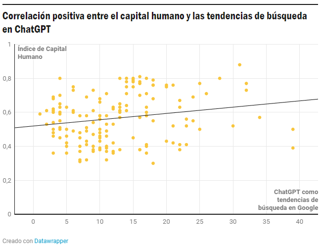 Aunque ChatGPT era de acceso libre y generalizado, resulta que sí existe una correlación positiva entre estas tendencias de búsqueda y las características de los países que son indicativas de las competencias de la población. Las búsquedas de "ChatGPT" tienden a representar una mayor proporción de todos los términos de búsqueda en los países que obtienen puntuaciones más altas en el Índice de Capital Humano del Banco Mundial (véase la figura anterior), y en los países con un mayor número de artículos CTIM (ciencia, tecnología, ingeniería y matemáticas, STEM por su siglas en inglés) por habitante (véase la figura siguiente). Este último, en particular, está fuertemente correlacionado con Google Trends, y puede entenderse como un indicador indirecto de la capacidad científica y de innovación de la población.6 Esto también implica que la gente de los países con menores ingresos busca menos ChatGPT, ya que los indicadores de capital humano están fuertemente correlacionados con el producto interior bruto (PIB) per per cápita.7