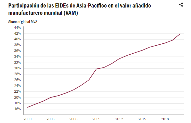 China representa la excepción a la dicotomía economía desarrollada, economía en desarrollo, y se recuperó con relativa rapidez debido a la rápida respuesta del gobierno al inicio de la pandemia. Esto es emblemático de otra megatendencia industrial, que ha sido testigo de un cambio sustancial en el poder económico en las últimas décadas, especialmente hacia el este y el sudeste de Asia. El gráfico siguiente ilustra el aumento constante de la proporción del valor añadido manufacturero (VAM) mundial que aportan las economías industriales en desarrollo y emergentes (EIDE) en la región de Asia-Pacífico, que incluso insinúa una aceleración desde el inicio de la pandemia.
