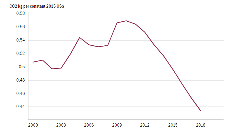 Emisiones industriales mundiales de CO2 por unidad de MVA (kg/2015 $)