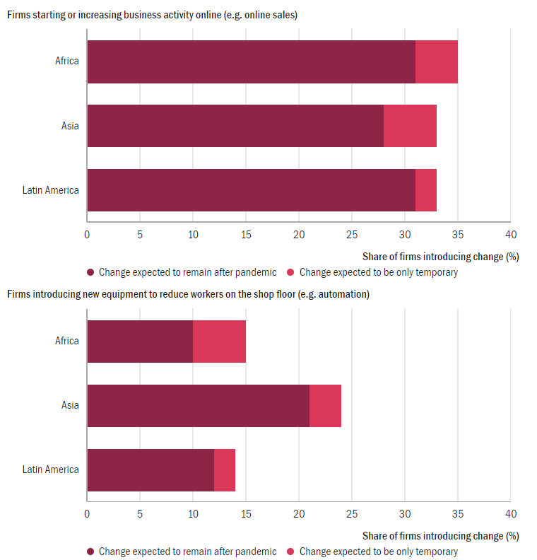 Como se ilustra en la figura 2, sólo un pequeño porcentaje de empresas (en rojo) consideraría volver a los métodos de producción anteriores a la pandemia, mientras que las innovaciones digitales -como el comercio en línea y la automatización- probablemente saldrán aún más reforzadas de la pandemia.