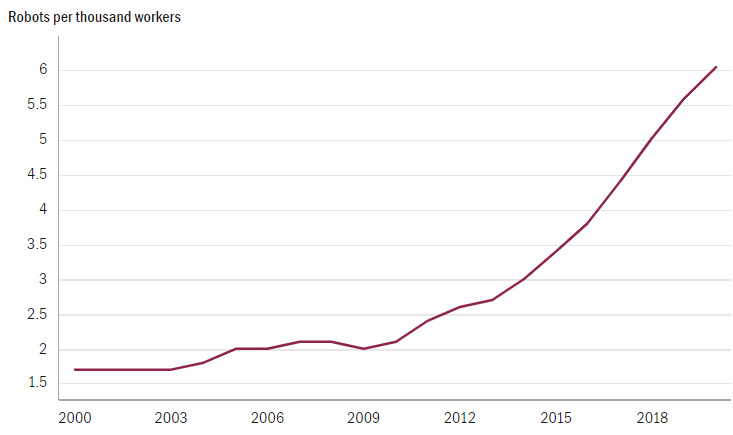 La innovación tecnológica afecta a todas las esferas del desarrollo empresarial y altera considerablemente las ventajas competitivas de las empresas y los países. La megatendencia de la digitalización engloba una serie de cambios tecnológicos, desde la aparición de potentes plataformas en línea hasta la difusión de los teléfonos inteligentes y los servicios de consumo relacionados, la impresión en 3D, la automatización de las fábricas y la tecnología blockchain en la producción. Muchas de estas innovaciones se refuerzan mutuamente. Están transformando profundamente la forma en que se organizan las economías, e incluyen la reducción de la necesidad directa de mano de obra, los cambios en las condiciones de trabajo, la disminución de los costes de transacción y la facilitación de la explotación de las economías de escala. El crecimiento de la robótica en la producción industrial (véase la figura siguiente) es indicativo de la progresión general de esta megatendencia en las dos últimas décadas.
