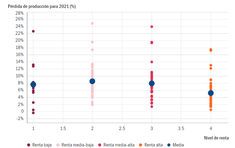 Nota: La pérdida de producción se define como el cambio porcentual entre el nivel de PIB proyectado antes de la pandemia para el año 2021 y la última proyección disponible. En el eje horizontal, 1 significa "ingresos bajos", 2 "ingresos medios bajos", 3 "ingresos medios altos" y 4 "ingresos altos".