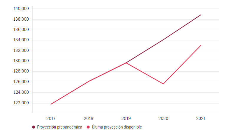 Nota: Proyecciones basadas en los datos de Perspectivas de la economía mundial del FMI. La proyección prepandémica se refiere a los datos publicados en la edición de octubre de 2019. Las últimas proyecciones disponibles se refieren a los datos publicados en la edición de octubre de 2021.