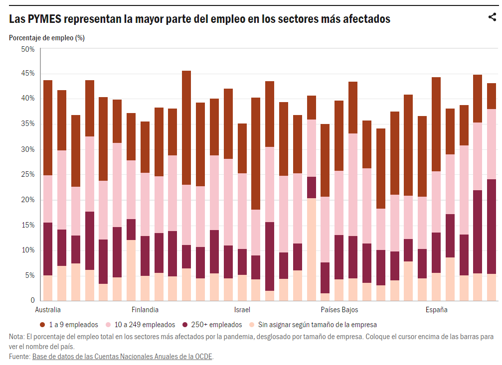 Las PYMES desempeñan un papel esencial para lograr un crecimiento económico mundial sostenible, superando los límites de la innovación y aumentando el empleo tanto en las zonas urbanas como en las rurales. Sin embargo, mantener el rendimiento de las PYMES y explicar su viabilidad supone un gran reto. Las PYMES representan el 99% de todas las empresas del sector privado en los países de la OCDE3. En el Reino Unido, por ejemplo, las PYMES representan el 61% del empleo total y el 52% de la facturación total4. Por término medio, las PYMES representan el 75% de los puestos de trabajo en los países de la OCDE, es decir, la mayor parte del empleo en los sectores más afectados por la pandemia, como la industria manufacturera, la construcción, el comercio minorista, el transporte aéreo y la hostelería5 (siguiente figura).
